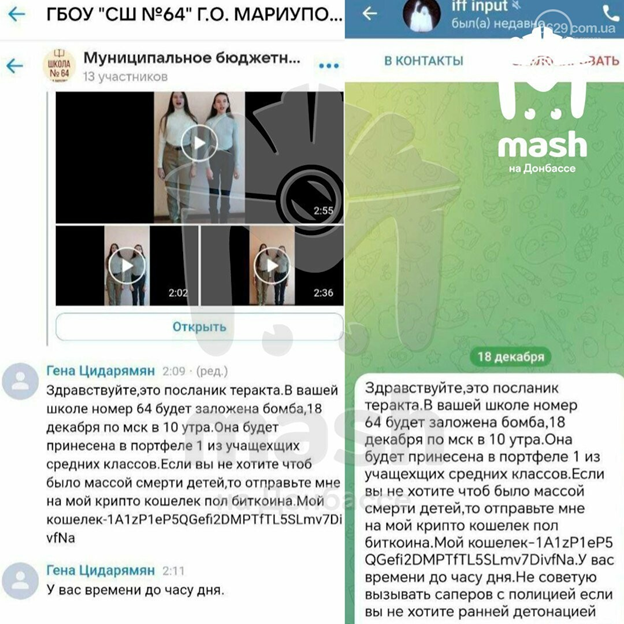 18 грудня в тимчасово окупованому Маріуполі через загрозу теракту відбулася евакуація учнів школи №64 Про це повідомляє редакція 0629 Згідно з наявною інформацією, керівництво школи отримало повідомлення про те, що один із учнів має принести до школи вибухівку у портфелі Невідомий терорист вимагав передати йому половину біткоїна та погрожував підірвати школу у разі невиконання його умов.